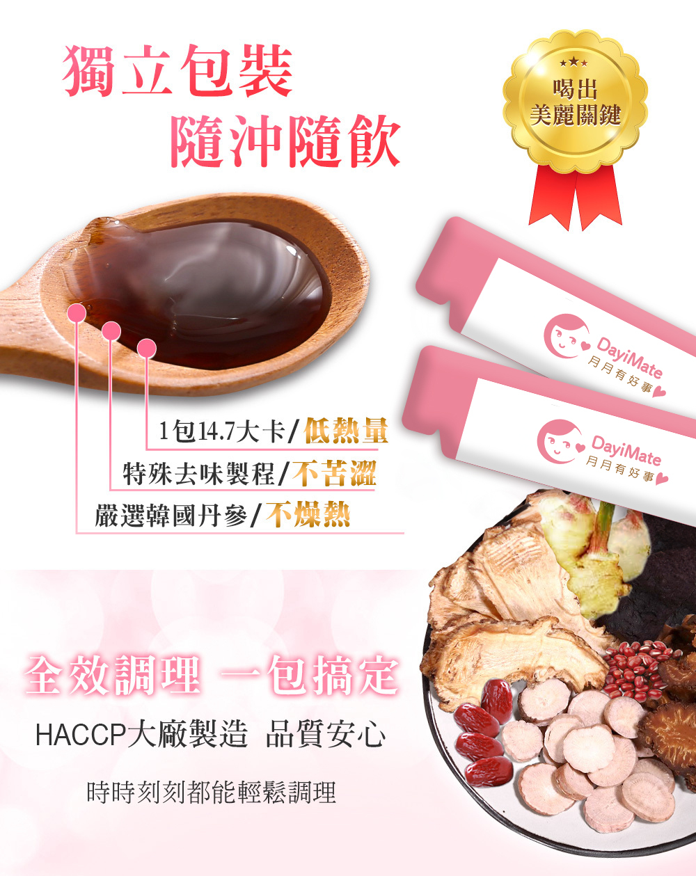 水、黑糖(蔗糖、糖蜜、焦糖色素)、高良月桃萃取液(水、高良月桃萃取物)、丹參萃取粉(丹參萃取物、麥芽糊精)、紅棗粉(辛烯基丁二酸鈉澱粉、紅棗萃取物、焦糖色素)、麥盧卡蜂蜜、桂圓萃取粉(麥芽糊精、桂圓萃取物)、當歸萃取粉(當歸萃取物、麥芽糊精)、柑橘果膠(柑橘果膠、蔗糖)、玉米糖膠、檸檬酸、川芎萃取粉(川芎萃取物、麥芽糊精)、熟地萃取粉(熟地萃取物、麥芽糊精)、益母草萃取粉(益母草萃取物、麥芽糊精)、白芍萃取粉、阿拉伯膠、桑葚果萃取粉、大豆卵磷脂、紅豆粉。
