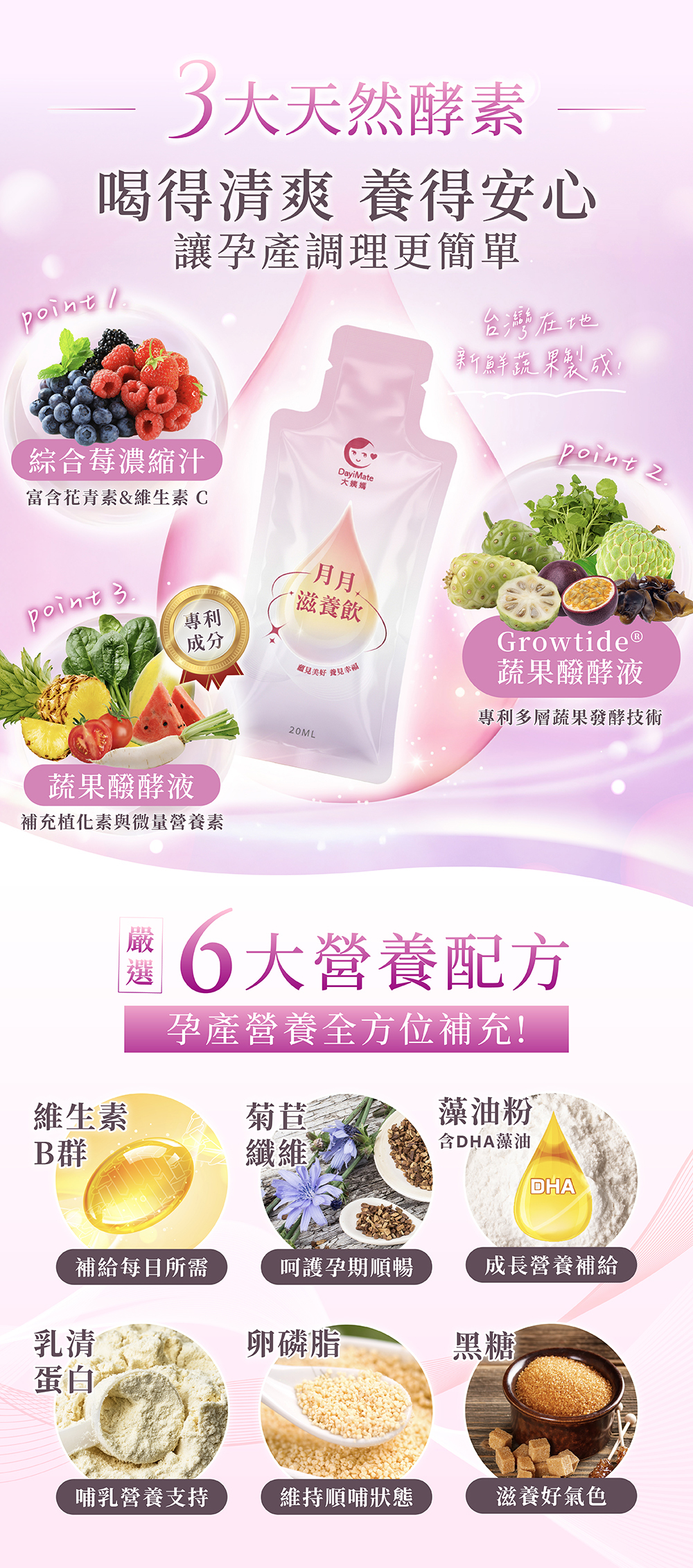 水、綜合莓濃縮汁(蘋果、蔓越莓、草莓、覆盆莓、櫻桃、黑醋栗、醋栗)、蔬果醱酵液(菠菜、檸檬、 甜瓜、番茄、芹菜、萵苣、冬瓜、小白菜、蘿蔔、鳳梨、木瓜、西瓜、哈密瓜、蕪菁、皇宮菜、絲 瓜、甘藍、瓠瓜、海茸、薏仁)、菊苣纖維、異麥芽寡糖、Growtide® 蔬果醱酵液(諾麗果、紅鳳菜、 黑木耳、釋迦、甜菜根、豆瓣菜、枇杷、百香果)、黑糖(蔗糖、糖蜜)、乳酸鈣、牛乳磷脂質、維 生素 B 群(乳糖、維生素 B1、維生素 B6、維生素 B2、葉酸、維生素 B12)、乳清蛋白、玉米糖膠、 藻油粉(乾燥葡萄糖漿、DHA 藻油、辛烯基丁二酸鈉澱粉、D-甘露醇、葵花油、抗壞血酸鈉、脂肪 酸甘油酯、多磷酸鈉、磷酸鈣、香料、混合濃縮生育醇(抗氧化劑)、卵磷脂、L-抗壞血酸棕櫚酸酯 (抗氧化劑))、黑醋栗抽出物(黑醋栗、麥芽糊精)、焦磷酸鐵。
